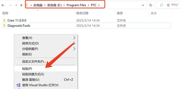 19、打开图示路径E:\Program Files\PTC(第13步设置的路径),在空白处右键粘贴。