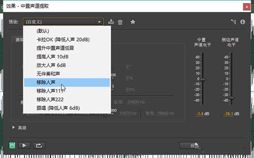 4、在弹出的菜单中选择”去除人声“选项,选择频率范围(男声,女声,低音);
