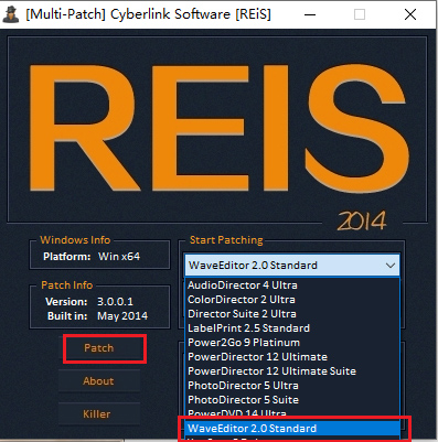 6、然后双击运行文件,弹出下图情况,选择“WaveEditor 2.0 Standard”,在点击一下“patch”。