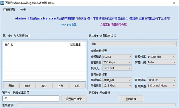 2.windows 7系统和windos 10系统请不要把软件安装在c盘,不要把视频输出存放目录设为c盘路径,这样会转不出视频,软件会运行出错!