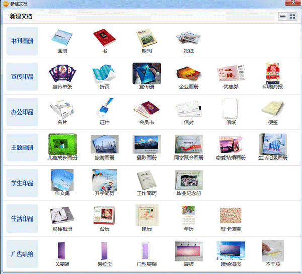 4、要设计印制什么产品,您只需在图示化的产品列表中选择就行,软件会按您选择的产品,按通行的标准的规格尺寸,把产品所需的各类页面创建好。