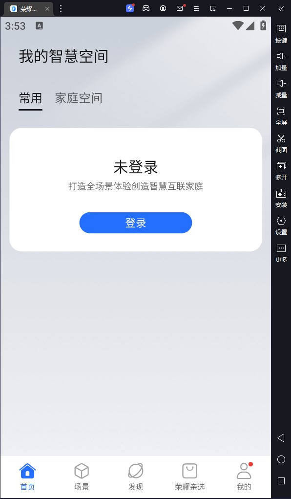 荣耀智慧空间电脑版是需要借助模拟器在电脑上运行的荣耀智能设备管理平台。用户使用软件可以与荣耀智能设备进行一键连接,实现互联互通,轻松快捷地控制智能设备,让操作变得更加便捷、简单、易用,让用户的智能生活更加富有趣味性和想象力。