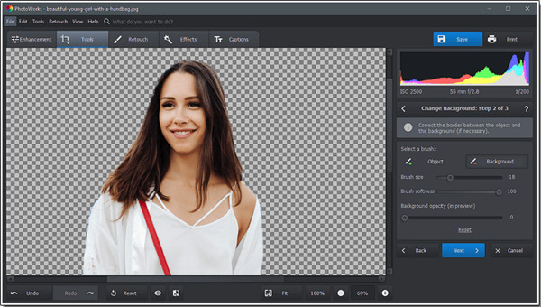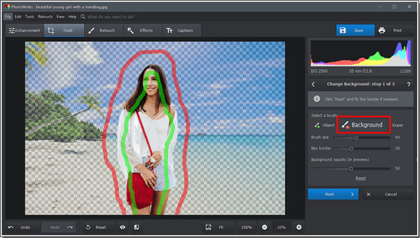 该程序将让您使用绿色画笔在前景上标记对象。调整画笔大小并标记对象或人。你不必仔细地把所有东西都涂上。只需画几笔,PhotoWorks 就会自动确定边缘