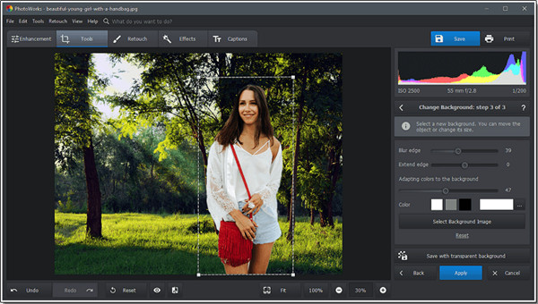 默认情况下,软件会为照片添加白色背景。您可以使用透明背景将其另存为 PNG 或用新背景替换背景。只需单击鼠标,您就可以将其颜色更改为黑色、灰色或标准调色板中的任何其他颜色。或者用图像替换它。PhotoWorks 中有大量现成的背景 - 您可以在“选择背景图像”按钮下找到它。检查一下 - 您可能会找到合适的。或者,上传您自己的图片以将其用作新背景
