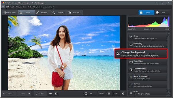 1、选择“更改背景”工具启动 PhotoWorks,导入照片以添加背景并切换到工具选项卡。从软件工具包中,选择更改背景