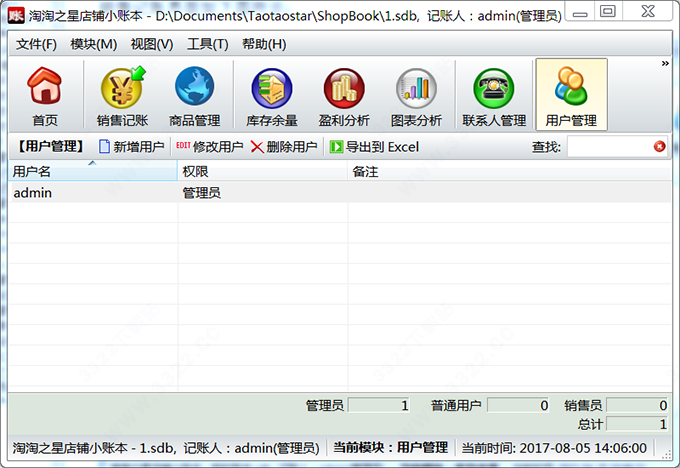 一个账本支持多个用户,用户分为管理员、普通用户、销售员三类,不同类型的用户有不同的权限;