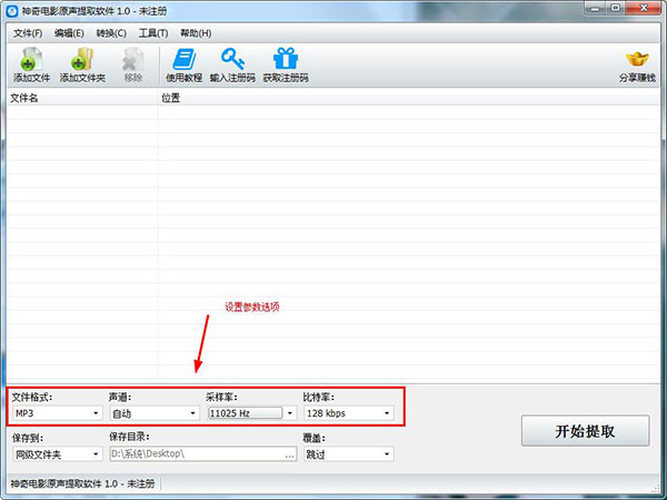 2、文件选择完毕后,可对提取的音频进行设置,软件支持文件格式设置、声道设置、采样率设置、比特率设置,如图所示: