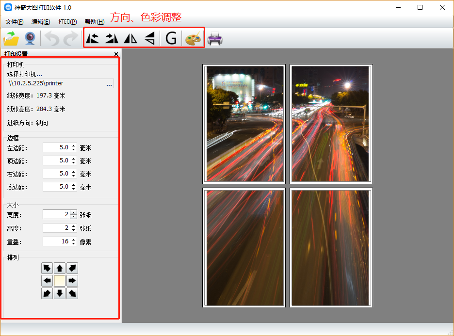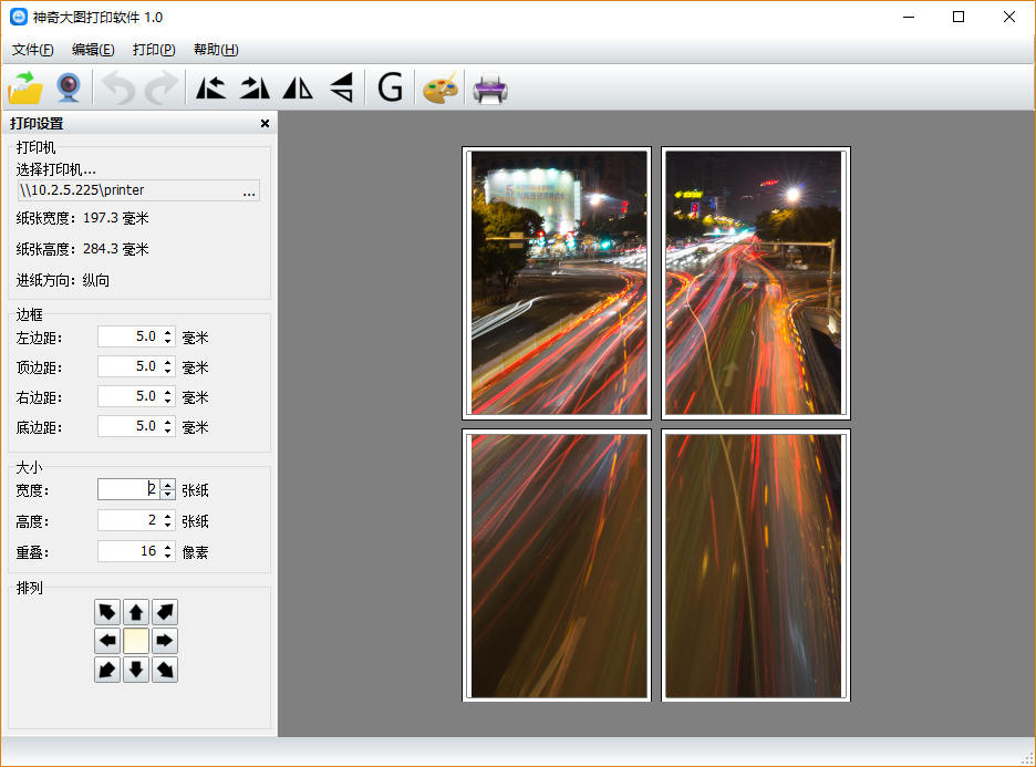神奇大图打印软件是一款专门的图片处理软件。这款软件能够帮助用户轻松的将单张图片进行拆分,拆分成为单张之后然后再次保存的软件。并且每一张都能单独的命名和操作。然后轻松的进行后续的选择操作,让用户的工作更加轻松,而且能够拆分也能够将多个图片合成一张大图,让用户更加自由的组合图片,让用户做图更加轻松,有很多的时间来进行业务的处理,有需要的用户可以下载这款十分专业的图片处理软件,它能够帮助用户快速的进行处理,简单就上手,快来这里试试看吧。