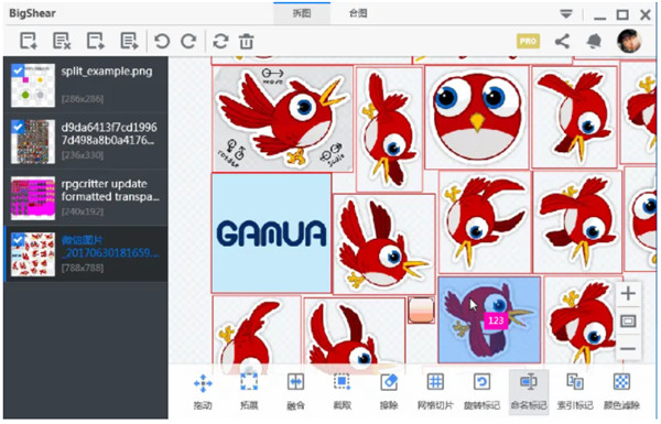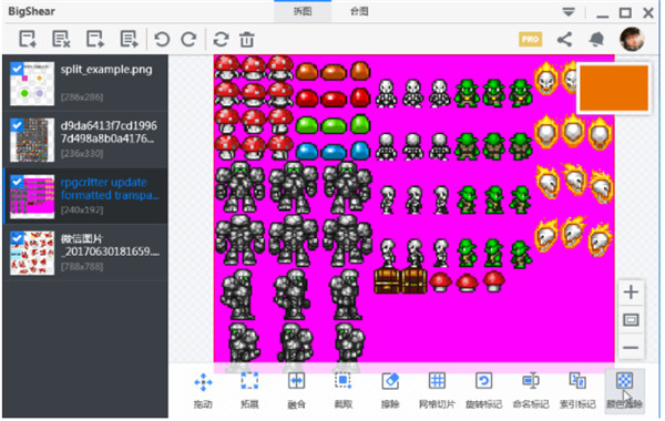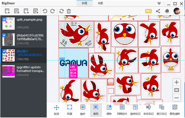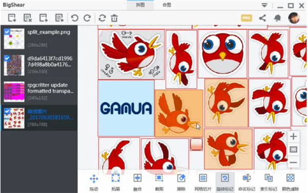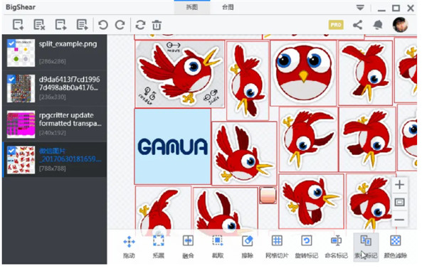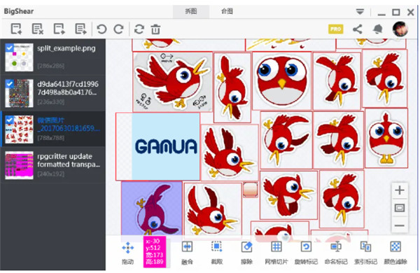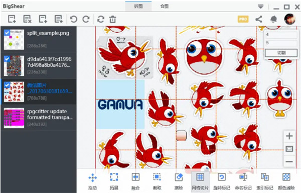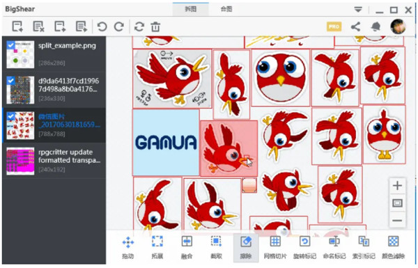 多见于游戏里“物品”的切片,如游戏背包里装的同一尺寸的物品,对这类png,可以用网格切片输入行数、列数即可