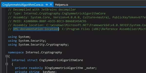 dotPeek 现在可以显示平台程序集的 XML 文档注释,涵盖名称与 XML 文档文件名称不同的程序集,例如 System.Private.CoreLib。 XML 文档的路径现在会显示在反编译文件的标题中。