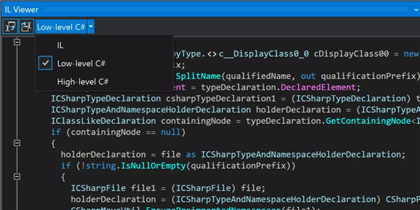 一个新增选项可供在 IL Viewer 工具窗口中查看反编译的高级和低级 C# 代码。 反编译的代码仍同步到代码编辑器中的源代码。