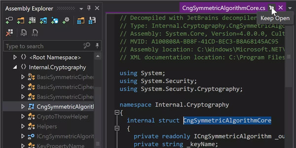 Assembly Explorer 现在支持转发类型(TypeForwardedTo 特性)。 Locate in Metadata(在元数据中定位)操作也适用于转发类型、程序集和模块引用以及资源。