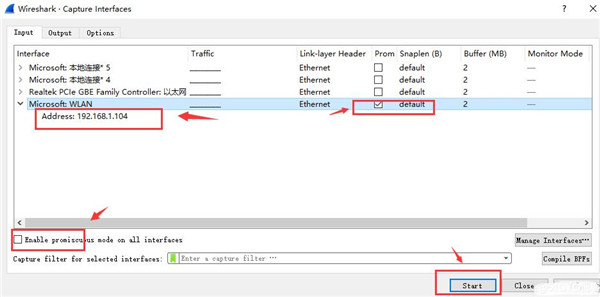 1、打开软件之后,选择菜单栏上Capture -> Option,勾选WLAN网卡(这里需要根据各自电脑网卡使用情况选择,简单的办法可以看使用的IP对应的网卡)。点击Start。启动抓包