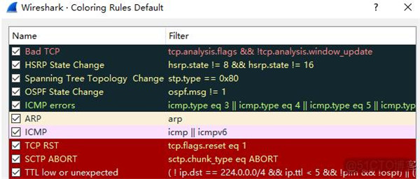6、数据包列表区中不同的协议使用了不同的颜色区分。协议颜色标识定位在菜单栏视图 --> 着色规则,如下所示。