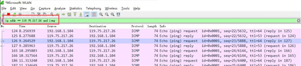 4、操作完成后相关数据包就抓取到了。为避免其他无用的数据包影响分析,可以通过在过滤栏设置过滤条件进行数据包列表过滤,获取结果如下。说明:ip.addr == 119.75.217.26 and icmp 表示只显示ICPM协议且源主机IP或者目的主机IP为119.75.217.26的数据包。