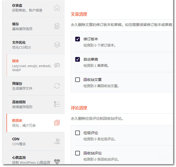 这些功能与 wp optimize插件基本都是一样的,所以用 wp optimizie清理也行。换个角度也可以理解成 wp optimize 可以被 wp rocket给取代。