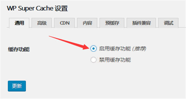 3、进入WP Super Cache设置中,通用选项当然是启用缓存功能,点击更新按钮才能保存并生效,后面都是这样。