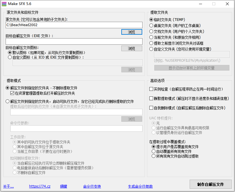 -选择如何提取自解压模块,或从源文件夹选择可执行文件 – 该文件将自解压解压后执行。