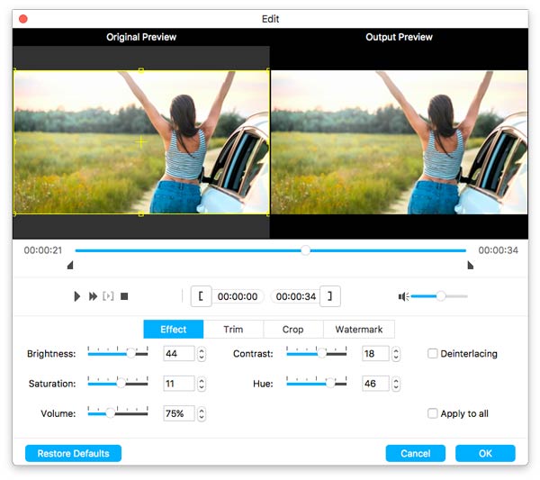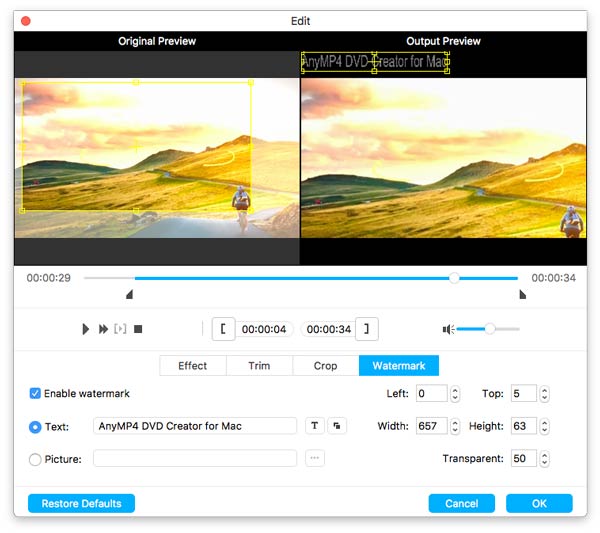 AnyMP4 DVD Creator允许您在刻录前编辑视频并调整输出效果。您可以调整视频效果,如对比度,饱和度,色调,音量等。此外,您可以剪辑/裁剪视频,合并视频片段并添加个人水印。使用此DVD刻录机,您可以更好地自定义视频,然后将其刻录到DVD。此外,您还可以为DVD添加音轨和字幕。播放刻录的DVD时,您可以根据需要选择合适的音轨和字幕。