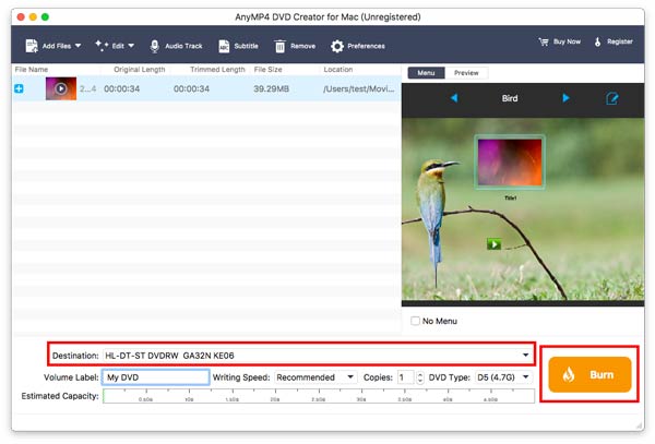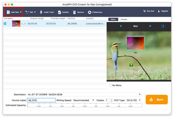 第一步。启动适用于Mac的AnyMP4 DVD Creator在你的Mac上启动这个程序,然后你会看到一个如下的界面。在这里,您可以添加文件、编辑视频、添加音频和字幕以及配置DVD刻录首选项。