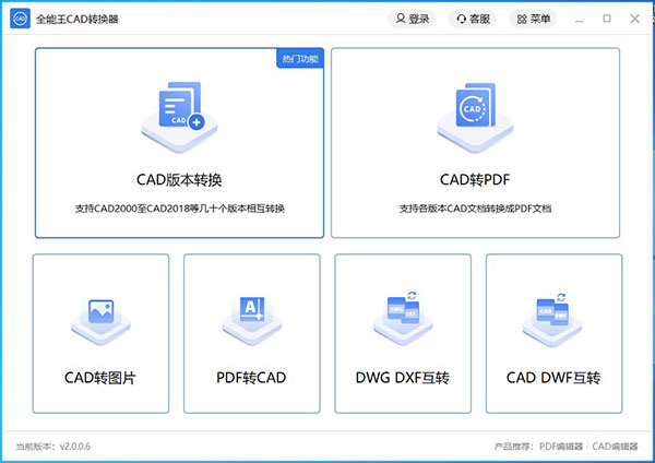 软件支持多种格式转换,包括CAD转PDF,CAD转JPG,PDF转CAD,CAD版本转换。