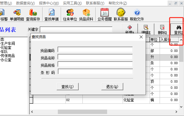 当需要查找货品的时候可以在货品资料列表中点击“查找”按钮,在出现的查找货品窗体中输入查询条件进行查找,同时也支持模糊查找。