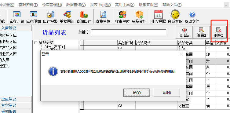 如果您想删除一条货品,点击货品列表窗体上面的"删除"按钮,在弹出的对话框中点击"是"即可成功删除,如果不想删除请点击"否"。如下图所示: