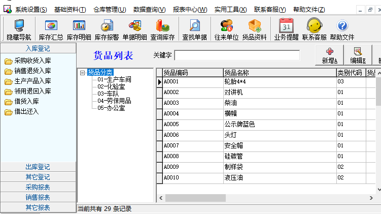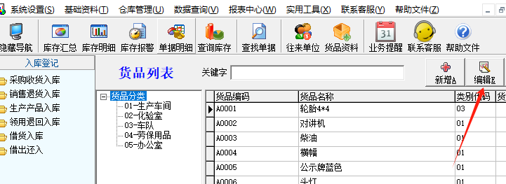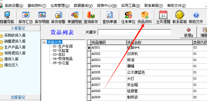 在货品资料编辑窗体中设置好某一货品的库存上限和库存下限值,这样当该货品的总库存数量超过库存上限和低于库存下限时,在库存报警中该货品资料就会示出来,起到警示的作用。