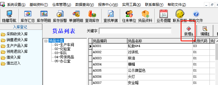 在货品列表窗体上点击"新增"按钮,程序会弹出“添加货品”窗体(如下图),依次填好各个项目(如类别代码,货品名称,货品规格,单位等)后点击窗体右侧的"添加"按钮,即完成货品资料的新增。