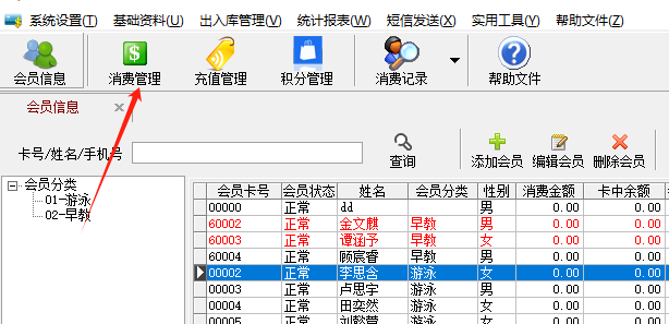 在主界面点击“消费管理”按钮。点击“新增消费”按钮,为该会员添加消费信息。