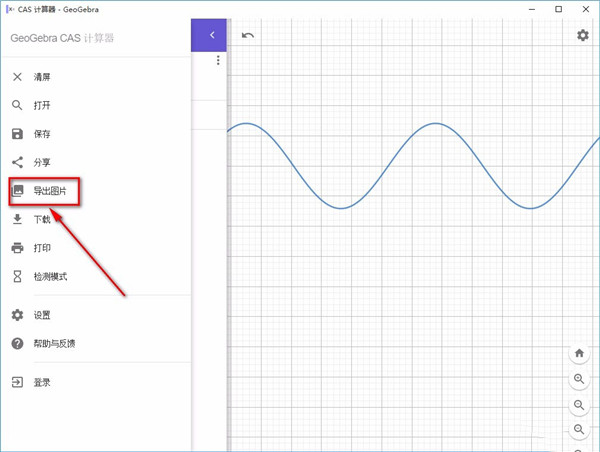 7、在下拉框中可以看到很多选项,我们找到“导出图片”选项并点击,就可以将绘制的函数图像导出软件了。
