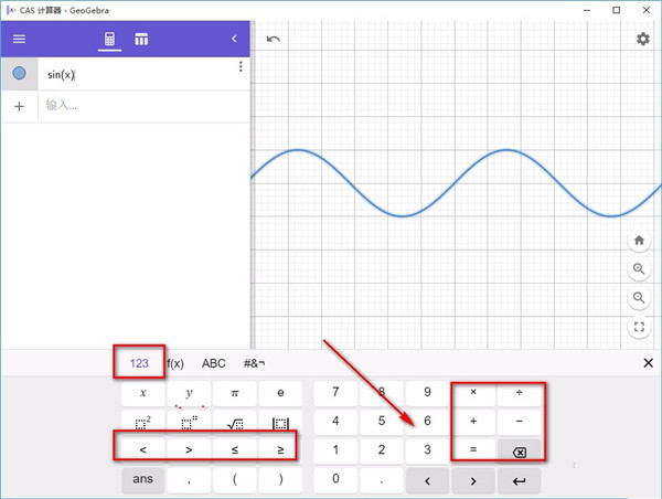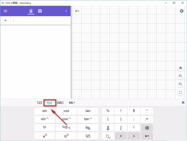 2、接着在界面下方找到一个类似键盘的窗口,我们在窗口中找到f(x)选项并点击,在其下方就可以见到很多的函数选项,我们根据自己的需要进行选择就可以了,比如小编选择sin。