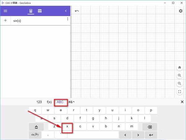 3、然后在界面左上方的文本框中就会显示sin函数,这时候在键盘上点击ABC,并在其下方选择X作为自变量。