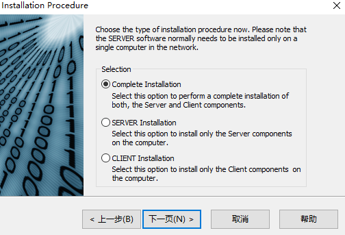 4、选择,提供了完成安装、服务器安装、客户端安装等多种功能