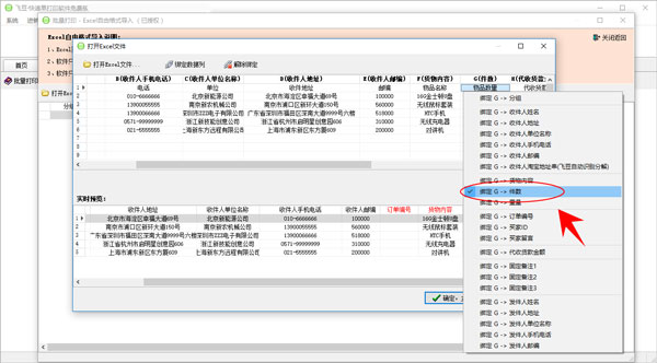 5、一般而言,卖家从电商网站下载的销售单进行快递单打印,名称,地址,电话等格式都相对固定,我们进行Excel文件首次导入时,有时需要进行“绑定数据列”,这样在以后导入同样格式的Excel文件时,飞豆快递单打印软件会智能识别以前绑定过的数据列,直接导入即可,减少时间成本。下图为卖家销售单格式,我们要对其进行导入后批量打印