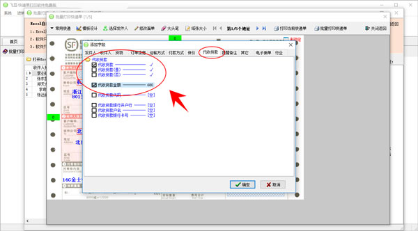 15、模板中没有“代收货款金额”字段,可以手动添加上去,点击【模板设计】,选择【添加字段】