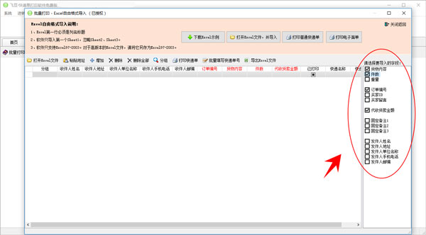 6、选择需要在快递单中打印的其他字段(★ 除非帮第三方代发件且导入的数据里有第三方发信人信息,否则不要勾选最下方的发件人,发件人手机电话,发件人地址等信息):
