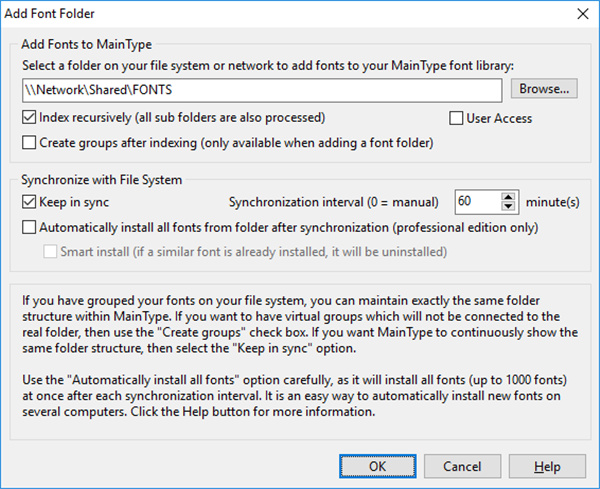 让MainType与“组”面板中的特殊组同步文件系统或网络上的特定文件夹,您将始终拥有最新的字体列表