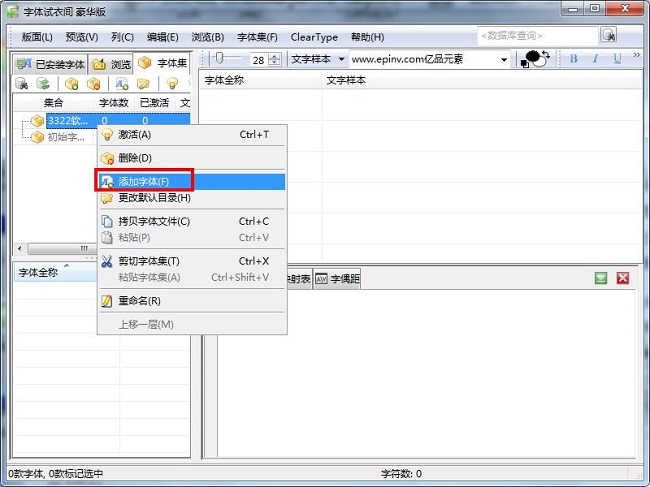 3、在新建的字体集名称上点击鼠标右键,选择“添加字体”菜单,