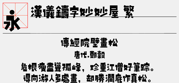 汉仪铸字妙妙屋繁字体是由汉仪字库出品的一款非常有创意的海报艺术字体,该字体笔触粗实,书写圆润可爱,整体效果非常美观大方。其字形粗实,笔画看上去也是非常的工整,其整体看上去书写效果极佳,可以很好的应用于文本装潢、信息展示、网页设计、篆刻制模、数据制作、装潢设计、计算艺术设计、视觉设计、字帖等一切合法应用场景,有喜欢的朋友可免费下载收藏。