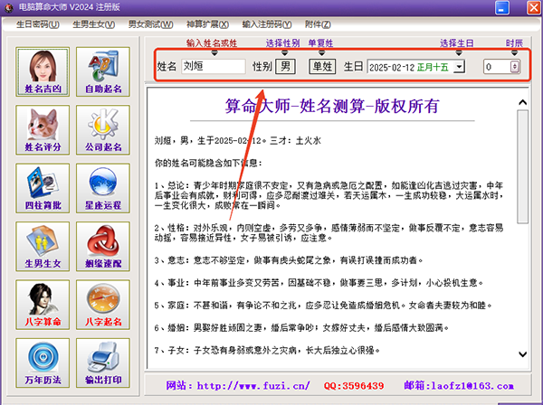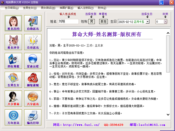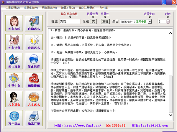 2、姓名吉凶:可以根据姓名、性别、生日进行吉凶测试,能够得到性格、意志、事业、家庭、婚姻、子女、社交等方面的预测。