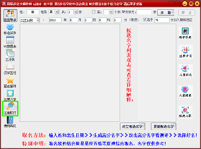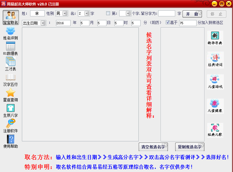 本软件采用了优化算法,能够在数秒钟起出成千上万的100高分姓名供您选择。