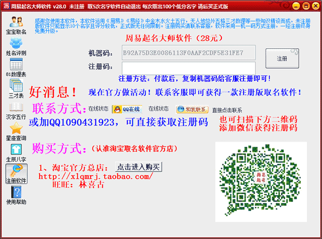 3、81数理表:数理之威力灵动于一切事物之中,譬如姓名之笔画、车牌之号码、楼宇之数字……均有着隐含的吉凶理义。然自然界任何整数,按九九归一原理,均可概为81之循环,因此,判定一数之吉凶,常只须看后4位尾数即可。周易起名大师软件列出1~81数之吉凶预示,供参考。