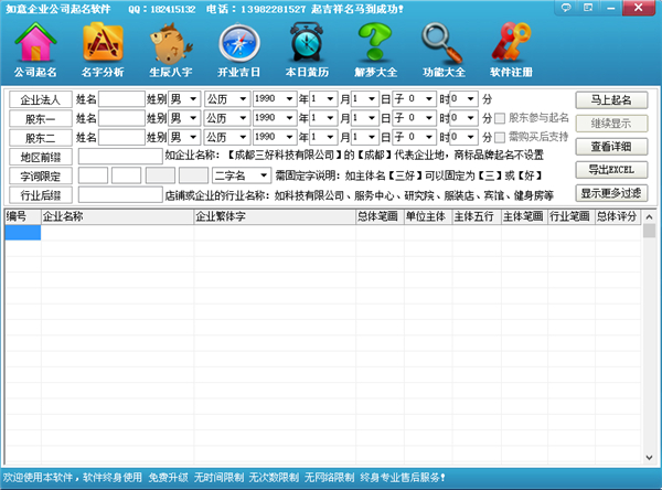 特别说明:软件提供的起名方法非常标准,非常符合常规起名方式、自动利用极佳的文字搭配起名,让你轻松完成公司或店铺起名,早日开张营业,马到成功!