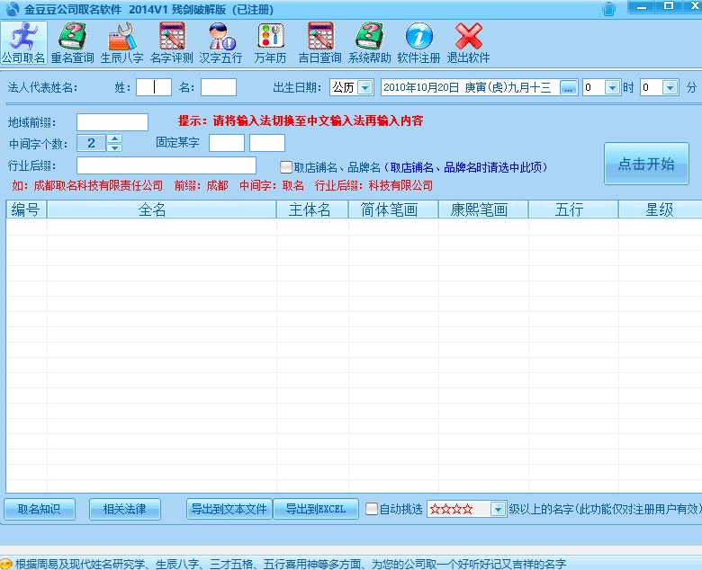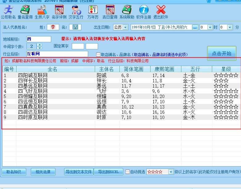 1.绿色版本无需安装,直接鼠标双击“金豆豆公司取名软件.exe”运行,进入软件后,输入相关信息,比如,法人代表名字,出生日期,行业后缀名等,最后点击“开始”便可在下方显示符合你公司全名2.挑选合适的名字后,点击“重名查询”即可对你的名字进行查询