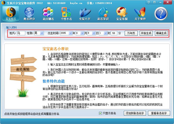 1、 使用简单,只要你有电脑,安装上本软件你的电脑就会变成一个高分起名专家。通过鼠标简单操作就可以为你的宝宝取一个专业的高分好名。2、可以根据收集整理了海量高雅好听的精美名子,通过软件的自动批量评分功能,用户只需要点击一下鼠标就可以得到适合你宝宝的既高分又高雅的精品名字。