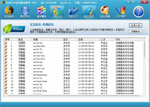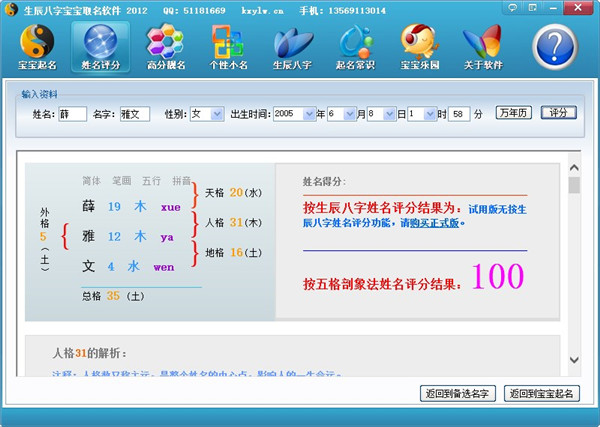 5、生辰八字五行宝宝起名软件还拥有强大的名字评分功能,不但可以用五格数理对姓名评分,还可以按生辰八字为姓名评分。