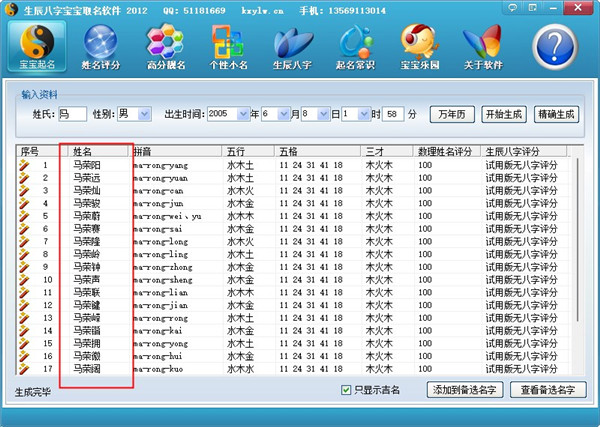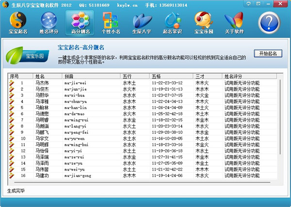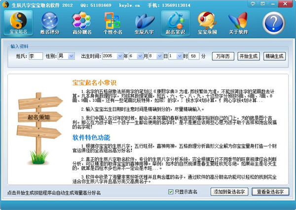 4、可以一键自动生成上千个既好听又高分又适合宝宝生辰八字的精美好名,供用户挑选。简单的操作,专业的结果,是最具权威的专业宝宝起名软件。