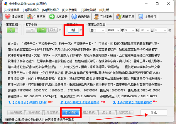 1、可以选择宝宝的性别,要取的字数,然后输入姓,这里我们选择诗词模式,选择生成