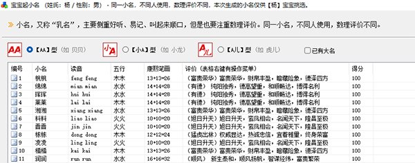 2、可根据笔画数、拼音、五行或指定含某字等方式在输出结果里筛选出满意的名字